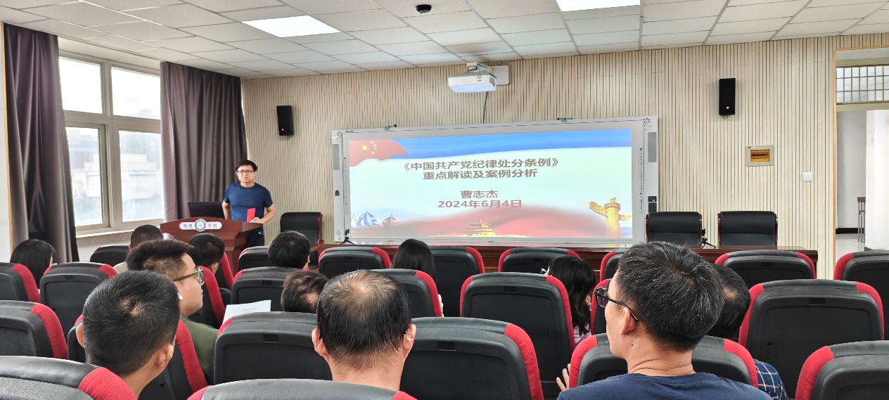 2024年6月4日,91论坛 全体党员在博远楼321会议室开展党纪学习教育书记讲党课活动。本次党课由学院党总支副书记曹志杰同志主讲,题目是“《中国共产党纪律处分条例》重点解读及案例分析”。结合《中国共产党纪律处分条例》,曹志杰同志强调党的纪律是党的各级组织和全体党员必须遵守的行为规则。在日常工作中,始终牢记自己的第一身份是共产党员,坚定信念,明确责任,以铁的纪律护航学院高质量发展