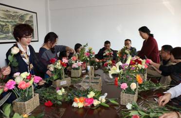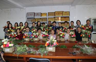 物理与电子电气工程学院分工会于2018年3月14日下午在博远楼209、210会议室举行插花艺术礼仪讲座和培训活动。活动由学院党委书记王志霄、学院分工会主席李春树分别主持,银川天地缘花店花艺总监戚建筠主讲,学院女教工和部分男教工参加。