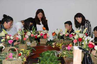 戚建筠首先介绍了中国传统插花讲究自然美、线条美和意境美,在不同意境下也讲究素雅、小巧、精细和清雅,插花不仅是一门设计艺术,在追求高超技艺的同时,也应注重插花过程中的礼仪;其次,她通过康乃馨、玫瑰等花向大家讲述如何修剪花枝,整理花材,强调修剪枝条应达到宛自天开的境界,花与容器的结合,注重整体美,要有花的尊严和状态,彼此的协调才是最完美的;最后,她让大家自由发挥,随意想象,随心而走,大家可从颜色、结构、造型等方面构造出自己心目中的花型,从高度、宽度与厚度方面考虑如何着手。同时,插花需要思考主花、副花和补花的适当搭配与巧妙结合。在插花的过程中,大家热情高涨,积极与戚建筠谈论插花知识及技巧。