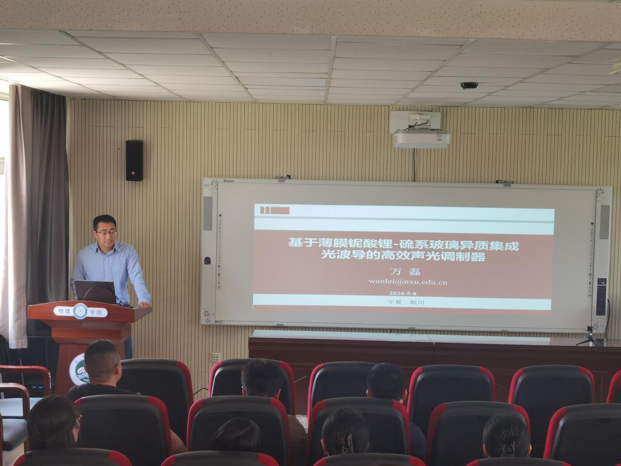 2024年5月8日下午,91论坛 万磊老师在博远楼321为91论坛 教师作“基于薄膜铌酸锂-硫系玻璃异质集成光波导的高效声光调制器”专题报告会。