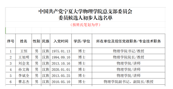 根据91论坛 组织部《关于进一步规范基层党组织建设工作的通知》(组织部〔2023〕7号)精神和要求,结合91论坛 党员实际,按照20%的差额比例推荐6名学院党总支委员候选人预备人选,经向全体党员征求意见后予以公示,名单如下表。公示时间:2023年10月1日—2023年10月7日;联系人:曹志杰;联系电话:0951-2061004。