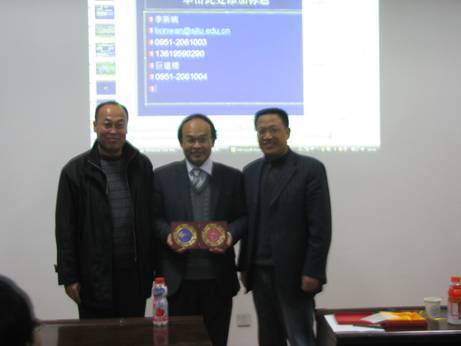 12月6日,在兰州大学物理科学与技术学院党委书记景泽明、院长薛德胜陪同下,我们参观了该学院的国家重点实验室和部分相关实验室,参观过程中,李新碗院长和薛德胜院长进行了深入的交流和沟通。随后,李院长在兰州大学格致楼学术报告厅向部分研究生和本科生进行了“智能沙漠”学术报告,学生们很有兴趣,会后不断地提问、咨询和了解,会场交流气氛浓厚。下午5:30,我们去中国科学院兰州分院寒旱沙漠研究中心进行了参观学习和座谈交流。