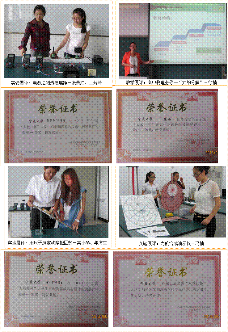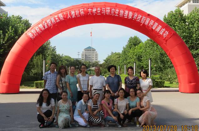 由中国教育学会物理教学专业委员会主办的“全国第五届‘人教社杯’大学生与研究生物理教学技能展评”, 2013年7月26日至28日在河北保定学院举行。91论坛 物理电气信息学院的3名指导教师、3名研究生和10名本科生,由王林老师带队组团参加了此次展评。与来自北京师范大学、华东师范大学和东北师范大学等全国106所高校近的一千多名选手同场竞技,91论坛 代表队荣获了3个一等奖、5个二等奖和6个三等奖,同时还获得了本届大赛的“优秀组织奖”,杨晓梅、张轶炳、王林三位导师分别获得“优秀指导教师”荣誉称号。