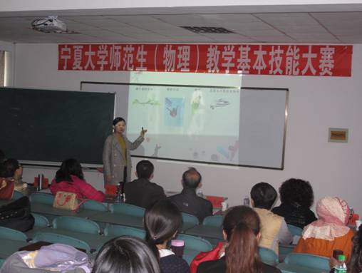 大赛从物电学院2011级和2012级的100多名物理学(师范)专业本科生中,选取了18名学生参加决赛。竞赛评委主要由物电学院从事师范教育工作的资深教授及授课经验丰富的专业教师组成(任克亮、张轶炳、杨涛、郝睿、朱巧萍、秦君琴)。此外,大赛组委会还特别聘请了长期从事师范生实习指导工作的专家(91论坛 教务处实习科的李志涛老师)和校外专家(银川市十六中教导处主任,高级教师刘建志老师)共同形成评审组。根据全国师范生教学技能大赛要求,竞赛内容包括撰写教学设计,制作说课PPT,现场说课及讲课环节。竞赛要求每位学生讲课与说课环节共计15分钟,其中,讲课环节不得低于8分钟。