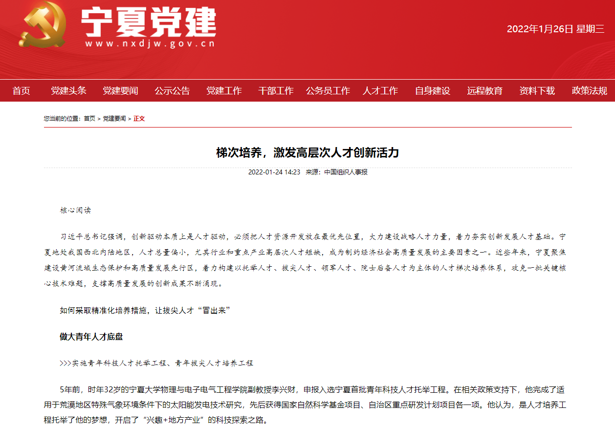 据宁夏党建网消息,近日《中国组织人事报》以《梯次培养,激发高层次人才创新活力》为标题,专版介绍了宁夏高层次人才培养政策。在该文中,全面介绍了宁夏着力构建以托举人才、拔尖人才、领军人才、院士后备人才为主体的人才梯次培养体系,支撑建设黄河流域生态保护和高质量发展先行区的“人才驱动”战略情况及其成果。91论坛 李兴财博士作为首批“宁夏青年科技人才托举工程”人选的典型代表获得该文关注。