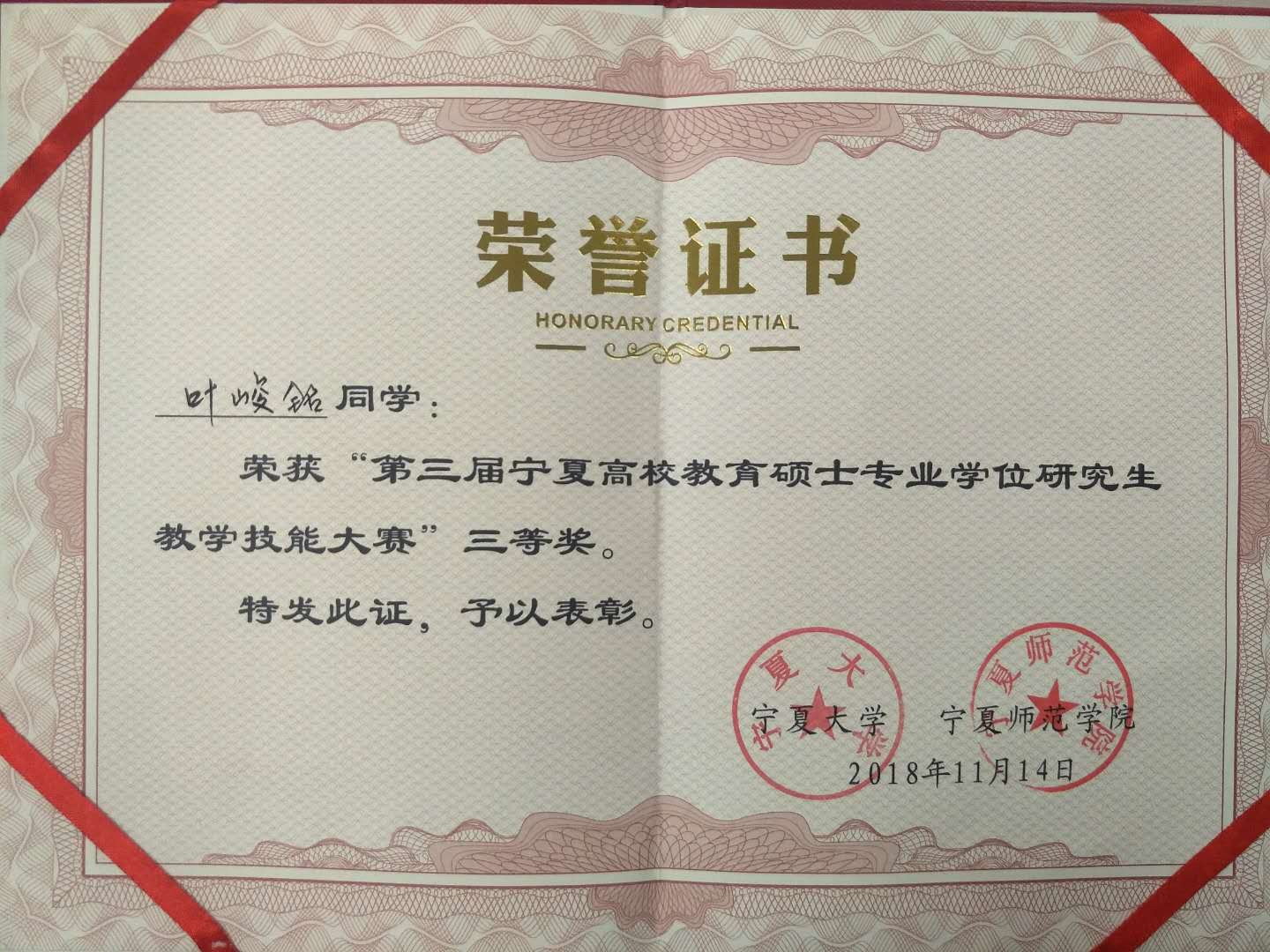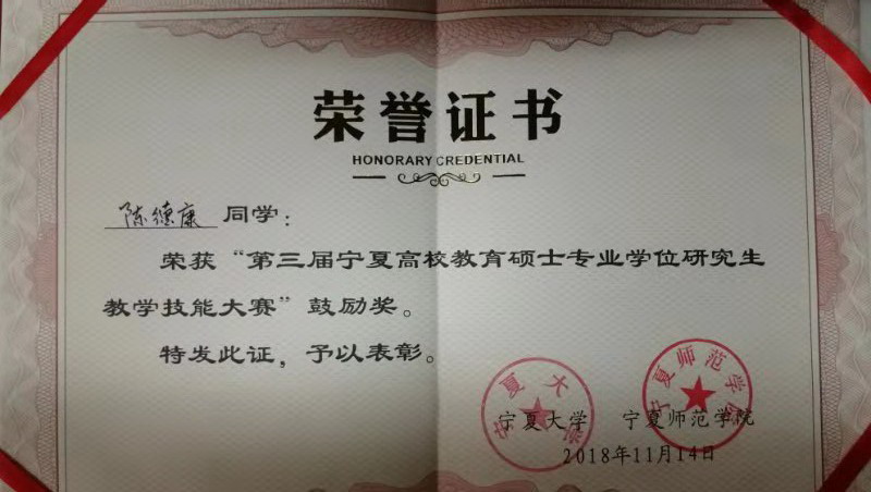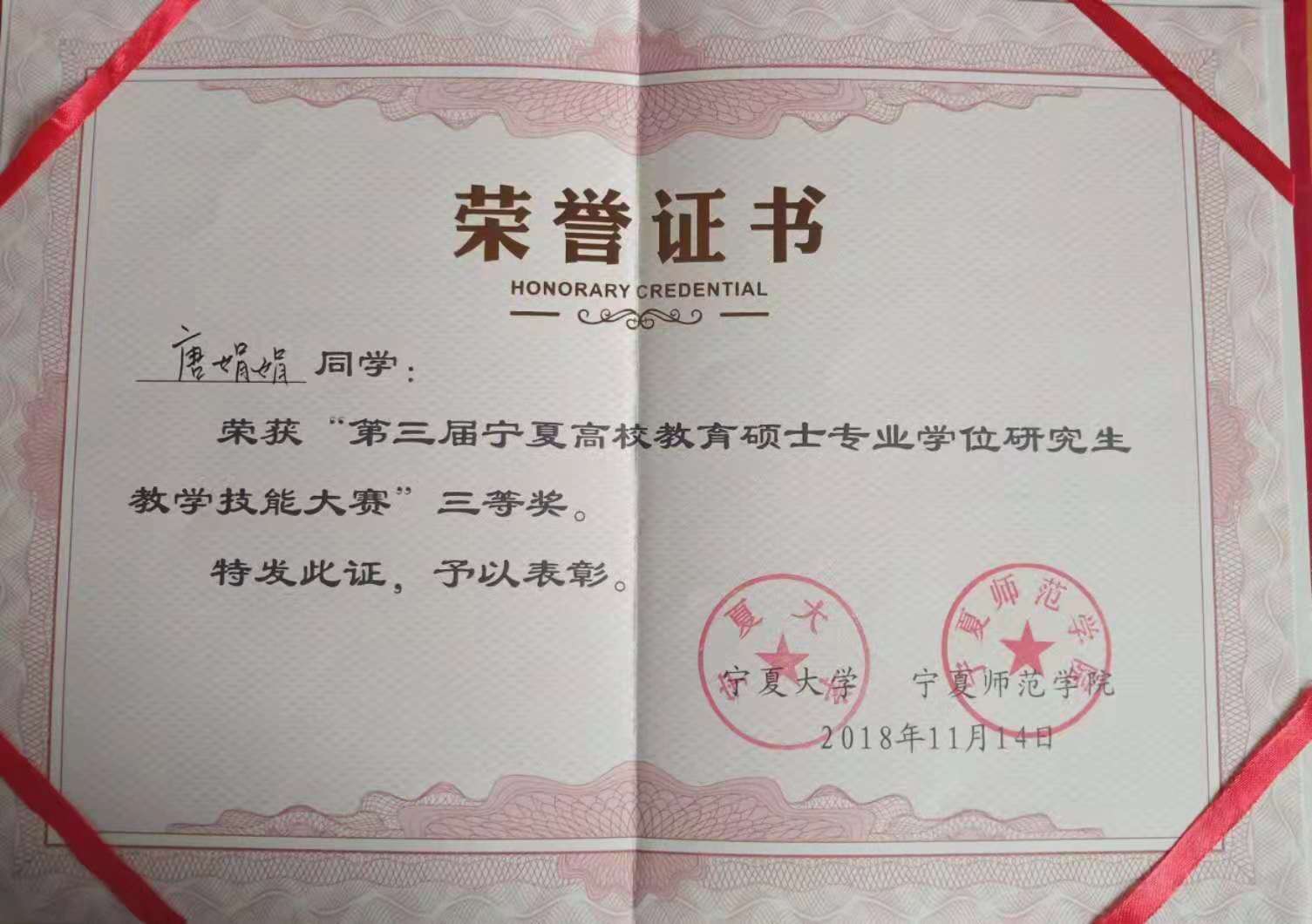 2018年11月14日,第三届宁夏高校教育硕士专业学位研究生教学技能大赛在91论坛 成功举办。91论坛 学科教学物理研究生叶峻铭和唐娟娟喜获三等奖,陈德康获得优胜奖。
