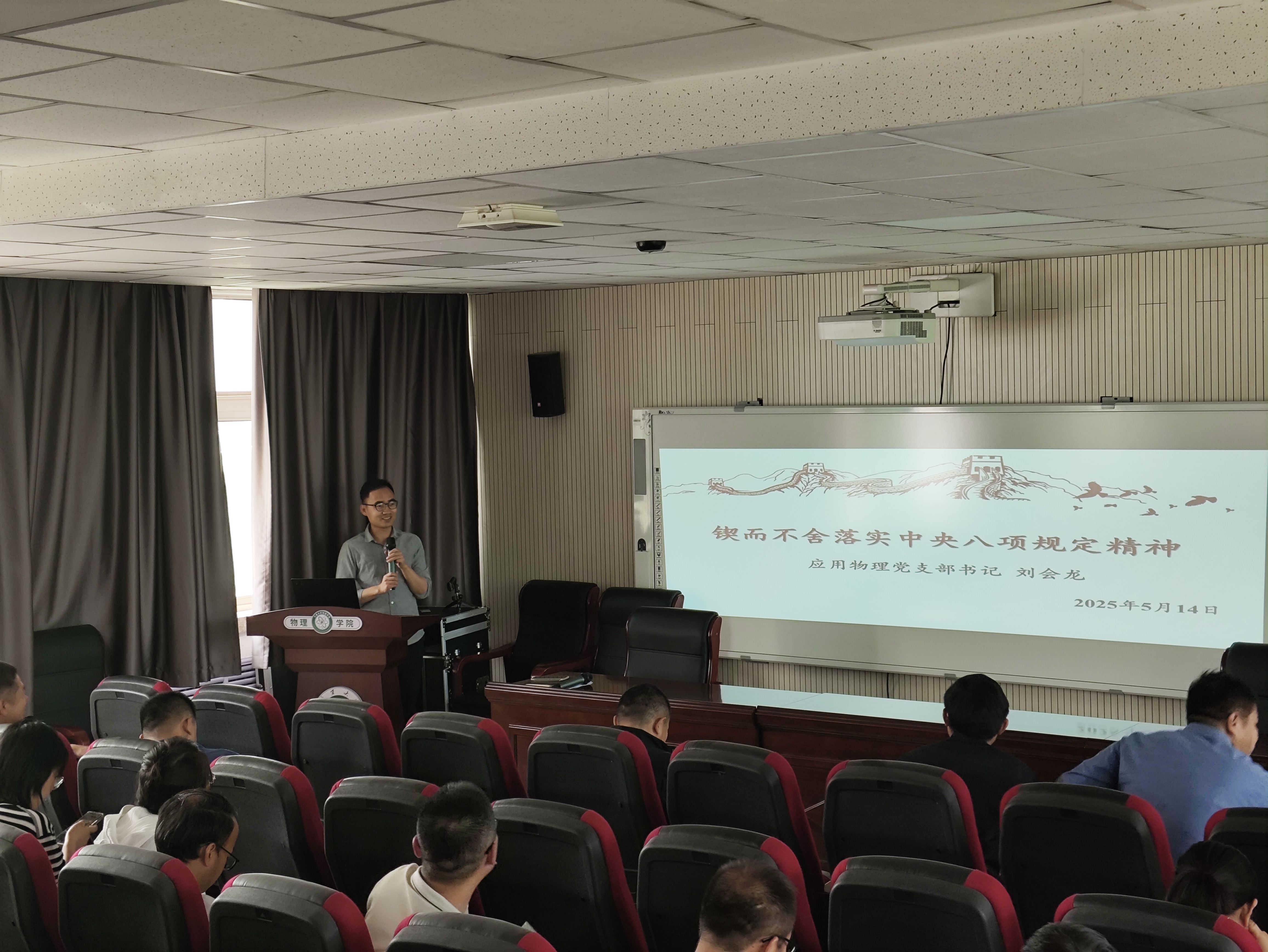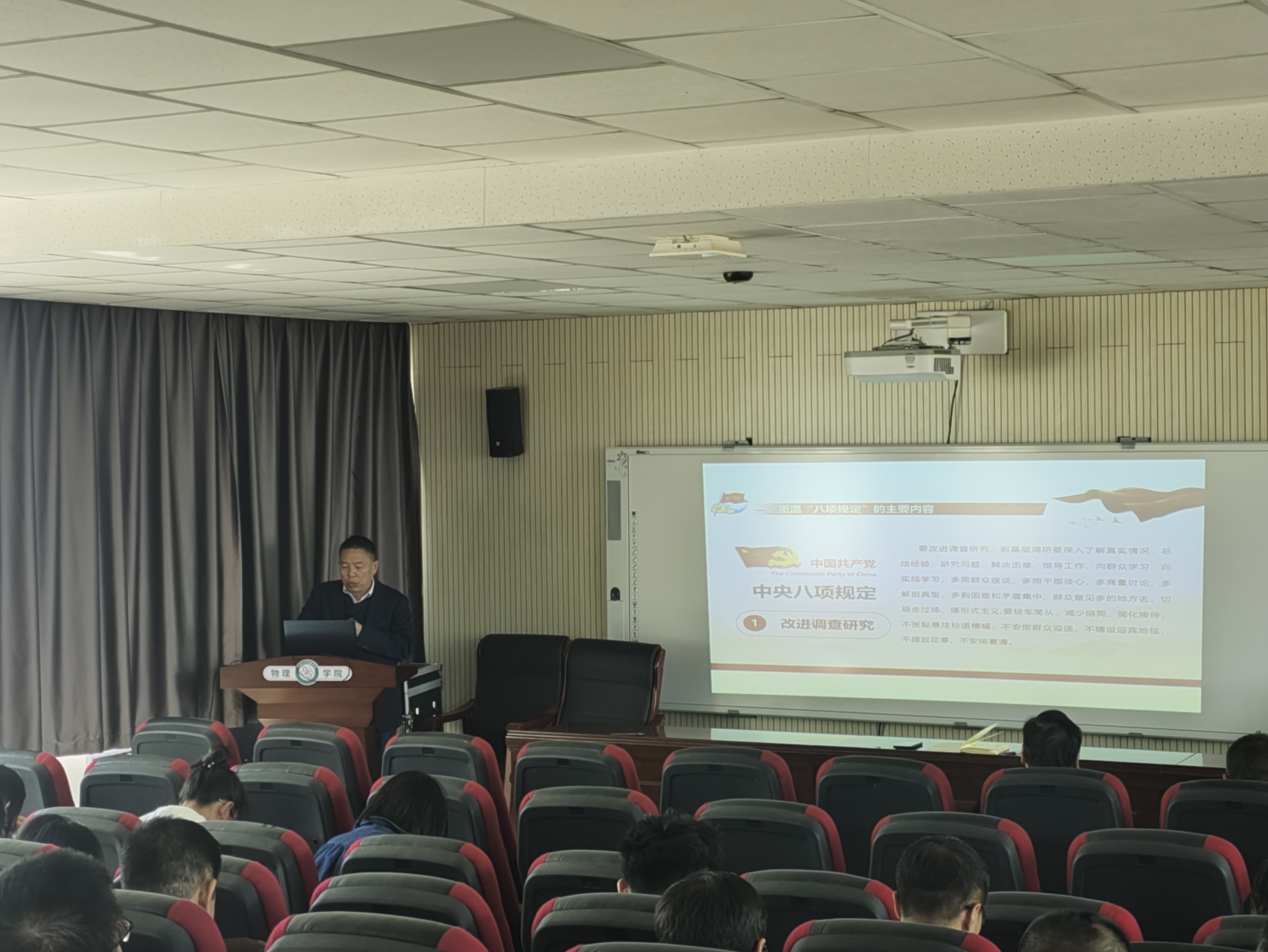 为深入贯彻落实全面从严治党要求,进一步增强全院教师的纪律意识和规矩意识,2025年5月14日,91论坛 在博远楼321会议室召开全院教师大会,学院应用物理教工党支部书记刘会龙以“锲而不舍落实中央八项规定精神”为主题,为全体党员教师上了一堂深刻的党课。刘会龙书记在党课中系统解读了中央八项规定精神的核心要义与实践要求。他结合习近平总书记在《求是》杂志发表的重要文章《锲而不舍落实中央八项规定精神,以优良党风引领社风民风》,强调作风建设是全面从严治党的重要切入点,必须常抓不懈、久久为功。中央八项规定不是一阵风,而是新时代全面从严治党的徙木立信之举,全体党员教师要深刻认识作风问题的本质是党性问题,始终保持赶考的清醒,以优良党风带动师德师风建设。此次党课引发了全体教师的强烈共鸣。与会教师纷纷表示,将以此次学习为契机,自觉对标对表,把纪律规矩挺在前面,做到心有所畏、言有所戒、行有所止