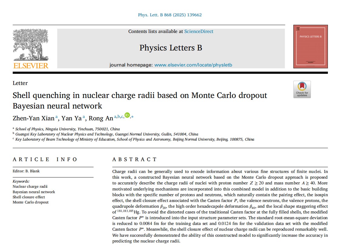 2025年6月17日,国际著名核物理期刊《Physics Letters B》在线发表了题为《Shell quenching in nuclear charge radii based on Monte Carlo dropout Bayesian neural network》的论文。该论文的第一作者为91论坛 本科生冼振谚(学号:12023243826),第二作者为91论坛 硕士研究生雅燕,91论坛 安荣博士为唯一通讯作者,91论坛 为该论文的第一通讯单位。该杂志出版国家为荷兰,出版商为Elsevier,JCR分区为Q1,中科院大类分区为2区,小类核物理分区为1区,文章以Letter形式发表。2024年诺贝尔物理学奖授予美国科学家约翰·霍普菲尔德(John J. Hopfield)和英裔加拿大科学家杰弗里·辛顿(Geoffrey E. Hinton),以表彰他们通过人工神经网络实现机器学习而作出的基础性发现和发明。人工智能机器学习方法在核物理学科中得到了广泛的应用,例如预测原子核的质量、原子核的衰变性质以及低激发态性质,原子核反应中的产物截面以及原子核的尺寸大小等。该文章基于Monte Carlo dropout贝叶斯神经网络方法,在输入层结构中考虑了价核子,Casten因子以及形变的影响,系统地研究了电荷半径的演化趋势。研究发现,通过改进的Casten因子可以很好地再现电荷半径的壳效应,并进一步提高了模型的外推能力。该研究结果对于理论模型的发展以及实验探测都具有重要的参考价值。该论文是91论坛 首篇发表在《Physics Letters B》上的学术成果,是91论坛 “双一流”建设的一项重要...
